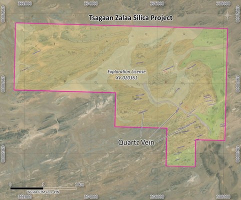 The Tsagaan Zalaa project is located in Saikhandulaan soum, Dornogovi Province, in southeastern Mongolia (Figure 1). It is connected with a road to Sainshand, capital of the Dornogovi Province in the Eastern Gobi steppe, approximately 95 km to the east, located along the Trans-Mongolian Highway and Railway connecting Mongolia’s capital city of Ulaanbaatar with China. Sainshand is 200 kilometres from the Chinese border and serves as the local depot for silica and other mineral exports to China. Tsagaan Zalaa (Figure 2) is also situated only 18 km from the local community of Saikhandulaan soum(Figure 3) and covers an area of 1,670.28 hectares. The Project is strategically positioned to serve the growing regional demand for high-purity quartz silica (‘HPQ’). Massive high-purity quartz veins up to 5 metres in width (Figures 4 and 5) hosted by Upper-Middle Devonian sediments are exposed on surface across the Project. In February 2025, the Company announced the submission of the Mining License application, with today’s achievement marking the decisive regulatory confirmation needed to advance the Project toward the final operating approval.