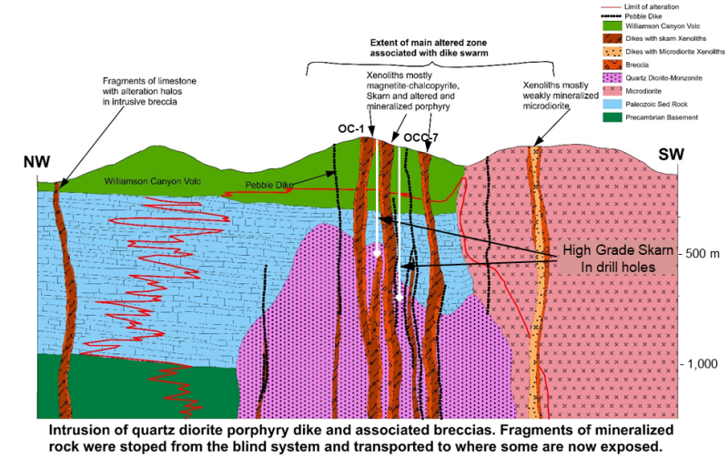 Historical drill holes cut high grade skarn mineralization including 23 meters with 0.54% Cu at 640 meters depth (hole OC-1), 18 m with 1.4% Cu and 4.65% Zn at 830 meters depth (hole OCC-7), and 7.6 m with 1.73% Cu and 0.11% Zn at 703 meters and 4.6 meters with 1.4% Cu and 0.88% Zn at 716 meters (OCC-8). Mineralization occurs within a several hundred-meter-thick altered zone hosted in favorable Paleozoic carbonate rocks that underly a sequence of Cretaceous andesitic volcanic rocks. These carbonates are the same rocks that host the high-grade copper mineralization at Freeports nearby Christmas mine. The historical drilling intersected a blind mineralized intrusion associated with the skarn mineralization, providing an immediate drill target that is believed to be the source of the mineralization at Hot Breccia (Figure 2). Several magnetic highs in the region surrounding the proposed intrusion may also indicated buried skarn mineralization and provide additional exploration targets.