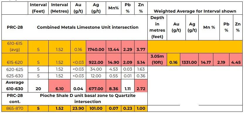 • including 15 feet (4.57 metres) at 248.17 g/t Ag, 0.52 g/t Au, 13.24% Mn, 0.96 % Pb and 1.55% Zn; and