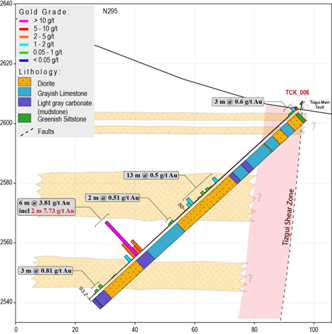 Figure 2. Cross section of drillhole TCK_006 showing drillhole geology and gold assays.