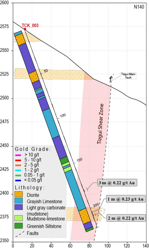 Figure 1. Cross section of drillhole TCK_001 showing drillhole geology and gold assays.