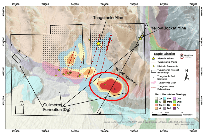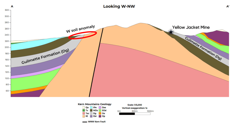 Click Image To View Full SizeFigure 2: A-A’ Cross Section at Tungstonia claim block showing the relationship between the Yellow Jacket Tungsten Mine and previously reported tungsten soil anomaly.