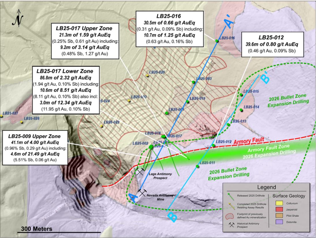 • LB25-017 Lower Zone (step-out, new ‘Armory Fault’ discovery): 12.34 g/t AuEq* over 3.0 meters (11.95 g/t Au and 0.10% Sb) within 8.51 g/t AuEq* over 10.6 meters (8.11 g/t Au and 0.10% Sb), within 2.32 g/t AuEq* over 86.8 meters (1.94 g/t Au and 0.10% Sb); due to drilling conditions, the hole terminated in 8.25 g/t oxide Au, with the highest interval up to 12.80 g/t oxide Au
