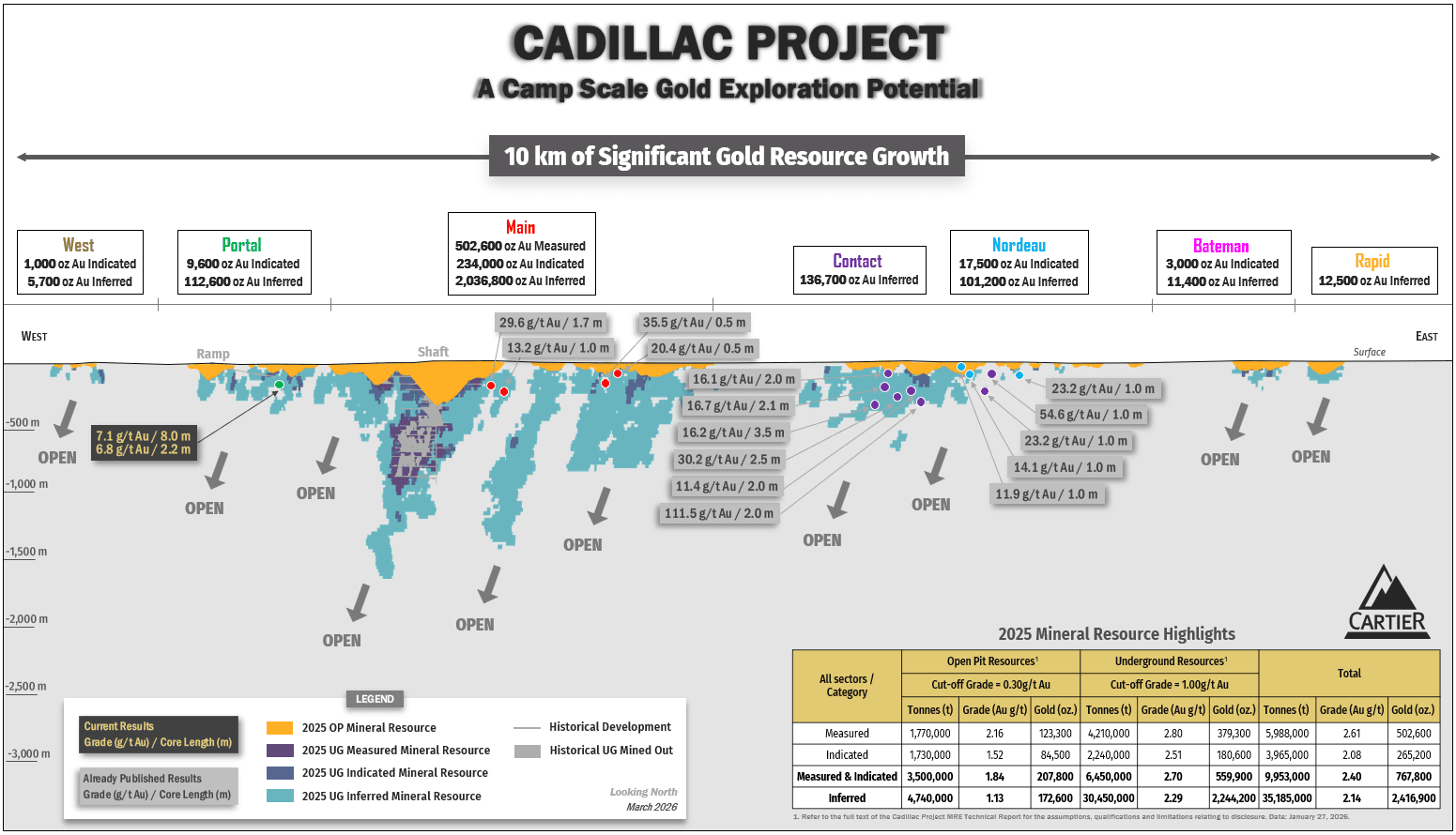 The Cadillac property contains total gold resource of 767,800 ounces in the measured and indicated category (10.0 Mt at 2.4 g/t Au) and 2,416,900 ounces in the inferred category (35.2 Mt at 2.1 g/t Au) across all the sectors. Please see the ″ NI 43-101 Technical Report and Mineral Resource Estimate on the Cadillac Project, Val-d’Or, Abitibi, Quebec, Canada. Pierre-Luc Richard, P.Geo. of PLR Resources Inc., Stephen Coates, P.Eng. of Evomine Consulting Inc. and Florent Baril, P.Eng. of Bumigeme Inc. ″, effective January 27, 2026.